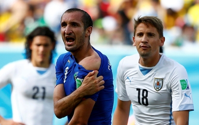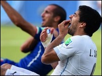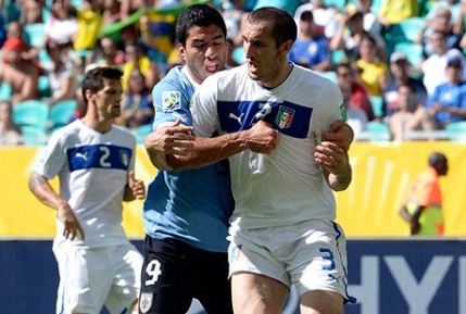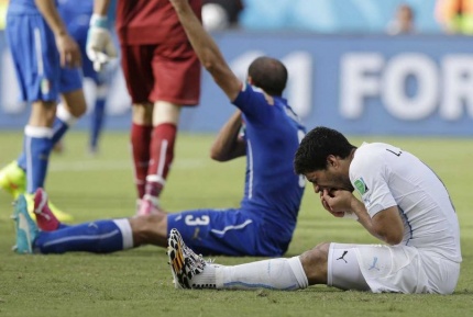 "Кеча Уругвай терма жамоаси ҳужумчиси Луис Суарес Италия терма жамоаси ҳимоячиси Жоржо Кьеллинини тиш ... Davomini o'qish