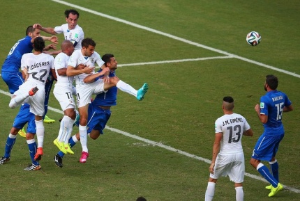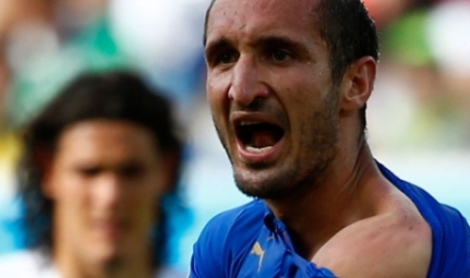 "Уругвай терма жамоаси ҳимоячиси Диего Лугано жамоадоши Луис Суарес ва Италия термаси ҳимоячиси Жоржи ... Davomini o'qish